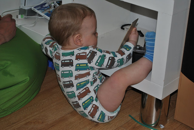 Nu kryper han obehindrat. Han ställer sig upp mot allt och försöker förflytta sig mellan soffan och soff-bordet. Han vinkar, kan High-five och säger pappa.